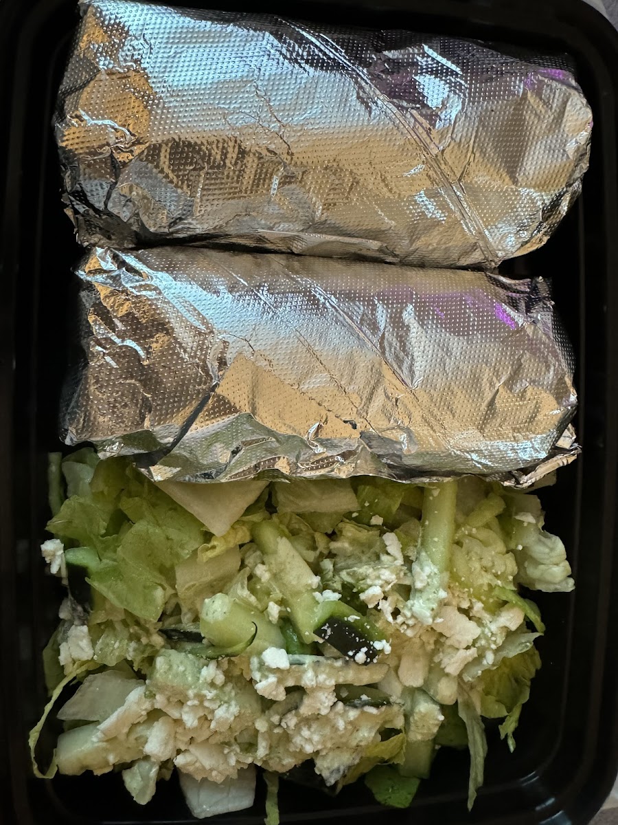 Two wraps served with a side of house salad made with lettuce, cucumber, cilantro sauce, and feta cheese. Each wrap contains seasoned beef gyro, tzatziki sauce, lettuce, tomatoes, and onions.