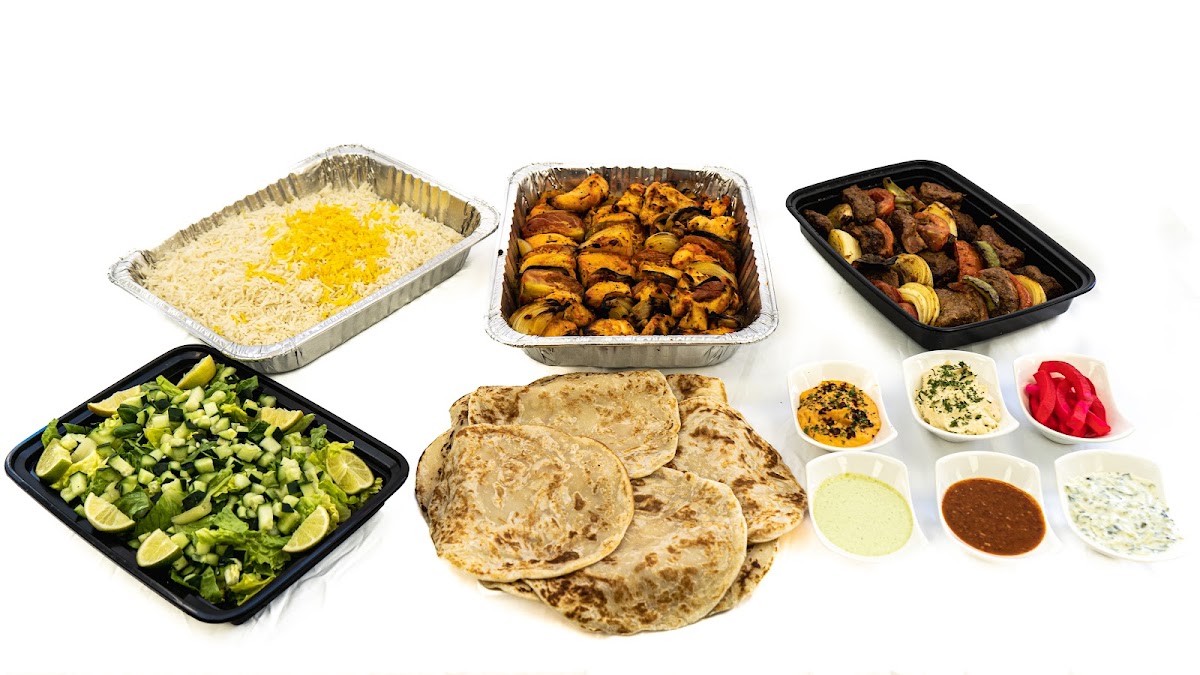 Perfectly grilled ground beef, marinated for six hours, served with aromatic rice, fresh salad, peri peri sauce, cilantro sauce, cheese, salad dressing, homemade hummus, tzatziki sauce, and homemade puffy breads.